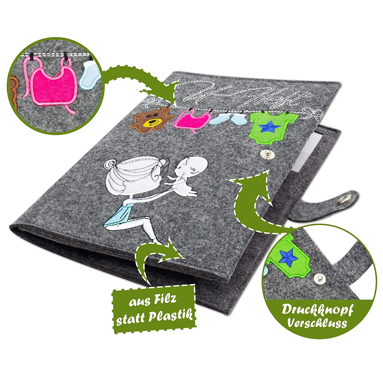 Progift Barato Promoção Logotipo Personalizado Bordar Elefante Cinza Premium Feltro Maternidade Log Pass Capa Bolsa Estojo Manga com Elástico Botão de Pressão Fecho de Zíper para Nova Mãe Presente