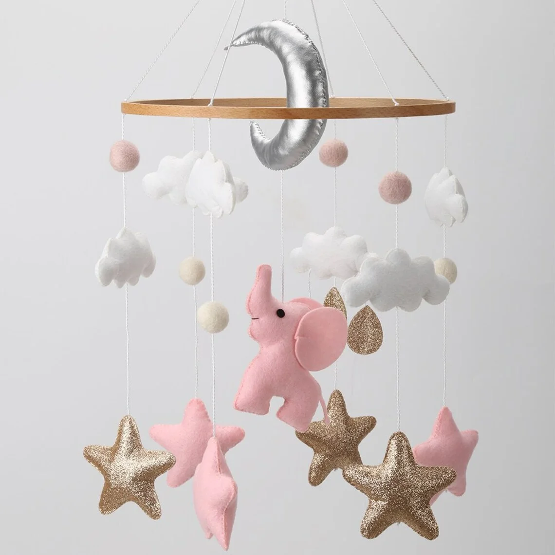 Nursery boho baby room decor girl hanging cute pink elephant star cloud musical felt mobiles for baby cot