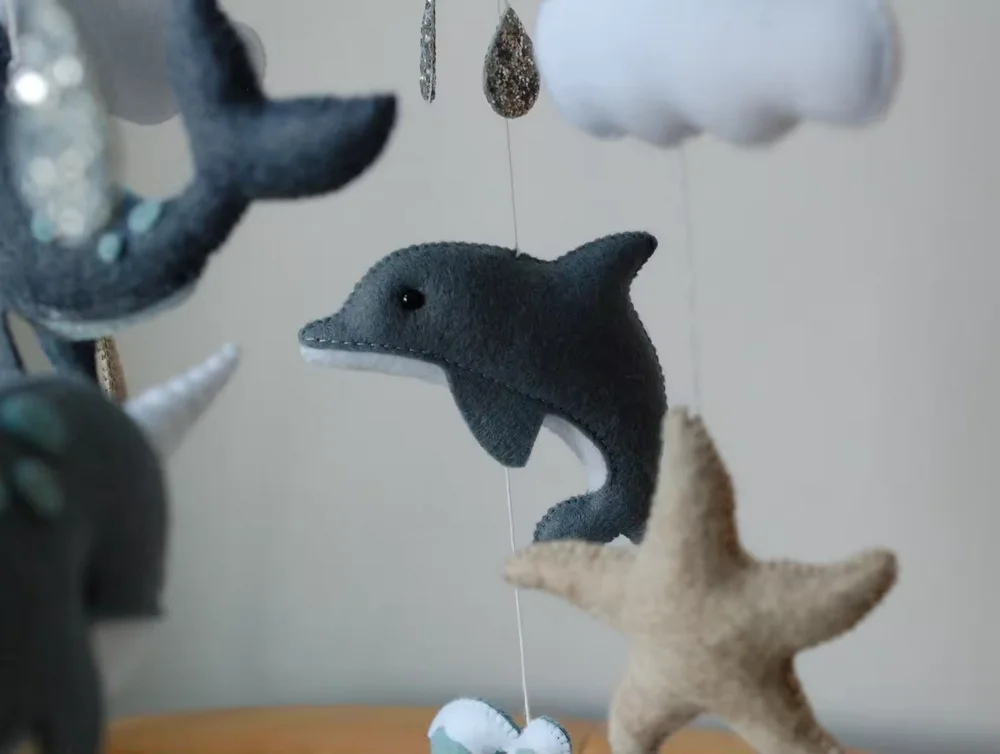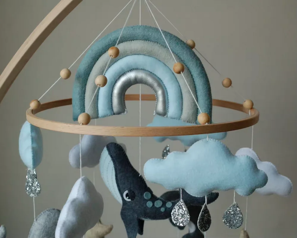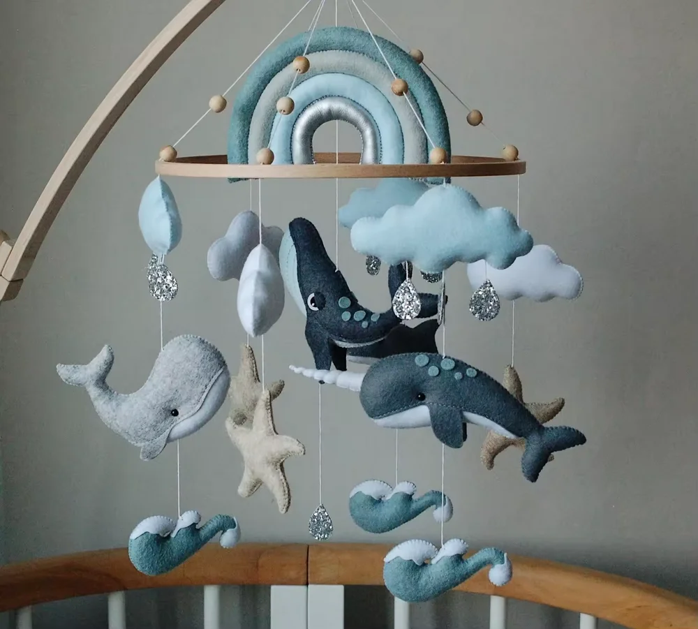 Berço de feltro personalizado com golfinho narval, ondas do mar, estrela do mar, baleia pendurada, móbile de berçário com arco-íris azul para presente de chá de bebê